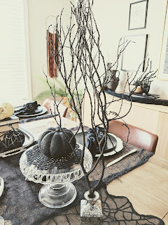 At the other end of the table for some more visual interest, I found these branches in the trail in front of our house and spray painted them black. I used a small silver jar from www.dollartree.com to hold the branches and I just created another easy centrepiece idea! Beside it I placed a glass thrifted cake stand from www.valuevillage.com, topped it with a crocheted black doily and a glittered black pumpkin from the dollar store.